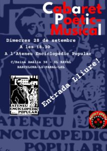 Cine Fòrum a l’Ateneu: Sin Techo ni Ley20 setembre, 18:45 - 21:00La recerca del seu lloc en el món d'una dona errant dins una societat arbitraria i opresivaCabaret poètic-musical28 setembre, 18:30Encetant la tardor amb el gran… Cabaret poètic-musical, a l’Ateneu Enciclopèdic PopularPresentació del llibre: Saavedra. Un anarquismo29 setembre, 19:00 - 21:00Vida i lluita de l'anarquista Abelardo Saavedra ToroHomenatge recordatori a Farika (Klitoris Llibertari) i Sebastià Roure5 novembre, 13:00Corría el año 1998 cuando, ocho personas, decidimos grabar algunas canciones utilizando una combinación básica de voz y guitarra. El resultado fueron 500 copias de casete tituladas “Voces Libe... Totes les activitats L’Ateneu Enciclopèdic Popular torna després de més de 80 llargs anys d’absència imposada, al mateix barri que el va veure nèixer i créixer durant 37 anys, i torna amb la mateixa voluntat de ser una eina útil al servei dels treballadors i treballadores per a construir plegades i des de l’autogestió espais naturals de llibertat. Reina Amàlia, 38 De dilluns a dissabte de 18:30 a 21 h. Centre de documentació històrico social En Presidio, La Novela Obrera , por Víctor Hugo Ada Martí 29 6 22 a l’ateneu enciclopèdic parlant de Dones lliures Mujeres Libres de España en el Exilio, nº 20, 1969 Ruta Llibertària pel Raval 2022 Solidaridad Obrera 47, 2 de octubre de 1945 Memoria apertura curso académico de Baeza 1871-1872 , por Alejandro Torres Puig Saavedra Un anarquismo, de Aurelio Fernández Fuentes, Presentació llibre a l’Ateneu Enciclopèdic/CDHS El hijo del Camino , Antonia Maymón, La Novela Ideal 237 Excursions 67 , 1 de novembre de 1920, butlletí de l’ateneu enciclopèdic Un cop més, ens trobem al CENTRE de DOCUMENTACIÓ HISTÒRIC SOCIAL / Ateneu Enciclopèdic Reflexions : Ara en el 45 i 120 aniversari
