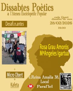 La Traviata de Giussepe Verdi12 febrer, 19:00Òpera a l’Ateneu XERRADA AMB FRAGMENTS DE VIDEO DE L’ÒPERA DE VERDI, AMB INFORMACIÓ SOBRE EL COMPOSITOR I LA GESTACIÓ DE L’OBRA, A CÀRREC DE JOSEP M. JENÉPresentació Enciclopèdic 45 a l’Ateneu Llibertari del Palomar13 febrer, 19:00 - 21:00Compartim, amb els companys i companyes de l'Ateneu Llibertari del Palomar, els processos i continguts de la revista de l'Ateneu EnciclopèdicMenys prohibicions, més drets. Contra l’Ordenança del civisme17 febrer, 19:00L’aprovació de la nova ordenança cívica el passat 19 de desembre (amb els vots a favor de PSC, Junts i ERC, i per descomptat de PP i Vox) i la... Read more » Totes les activitats L’Ateneu Enciclopèdic Popular torna després de més de 80 llargs anys d’absència imposada, al mateix barri que el va veure nèixer i créixer durant 37 anys, i torna amb la mateixa voluntat de ser una eina útil al servei dels treballadors i treballadores per a construir plegades i des de l’autogestió espais naturals de llibertat. Reina Amàlia, 38 De dilluns a dissabte de 18:30 a 21 h. Centre de documentació històrico social El CDHS/AEP recupera un cartell que és una història Un any més hem celebrat les Festes Alternatives i Populars del Raval, i ja són 20 edicions Ens ha deixat en Marcel·lí Reyes Sobre el Ateneu Enciclopèdic Popular, article de Valeria Giacomoni Taula Rodona: Perspectivas sobre los anarquismos L’Ateneu Enciclopèdic /CDHS al Centenari de l’AIT Presentació de La revolución sexual de nuestro tiempo, de Nadia Florencia Ledesma Prietto La Fàbrica, de Jordi Soler presentació a l’ateneu enciclopèdic El señorito, Margarita Amador La Novela Ideal 558, 21 de abril de 1937 Claudio Venza ens ha deixat avui a la seva ciutat natal, Trieste. Un amic de l’Ateneu Enciclopèdic que marxa