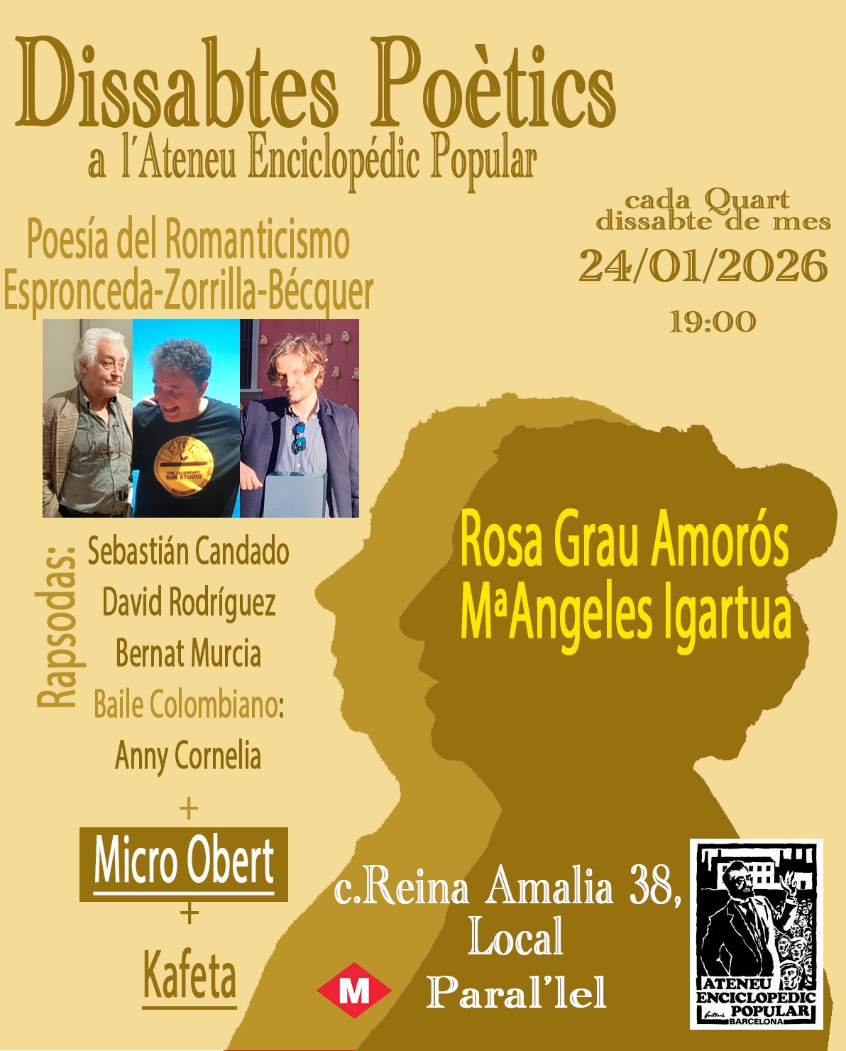 24 gener, 19:00 Quarts dissabtes poètics a l’Ateneu Enciclopèdic Popular Sala Margarita Xirgu Poesia del romanticisme ESPRONCEDA - ZORRILLA - BÉCQUER Amb les intervencions dels rapsodes Sebastián Candado, Bernat Murcia y David Rodríguez El ball colombià a càrrec d'Anny Cornelia Amb Micro Obert x si tens un poema propi o vols compartir-nos alguns dels que més t'agraden Amb Kafeta al final per recarregar piles Organitzen les companyes Rosa... Read more »