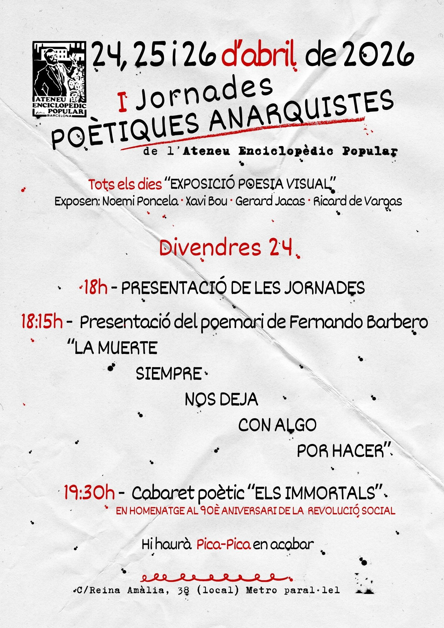 24 abril, 18:00 Presentació de les primeres jornades de POESIA ANARQUISTA de l’AEP Sala Margarita Xirgu A les 18h es farà la presentació de les jornades Seguit, a les 18:15h de la presentació del poemari de Fernando Barbero "La muerte siempre nos deja con algo por... Read more »