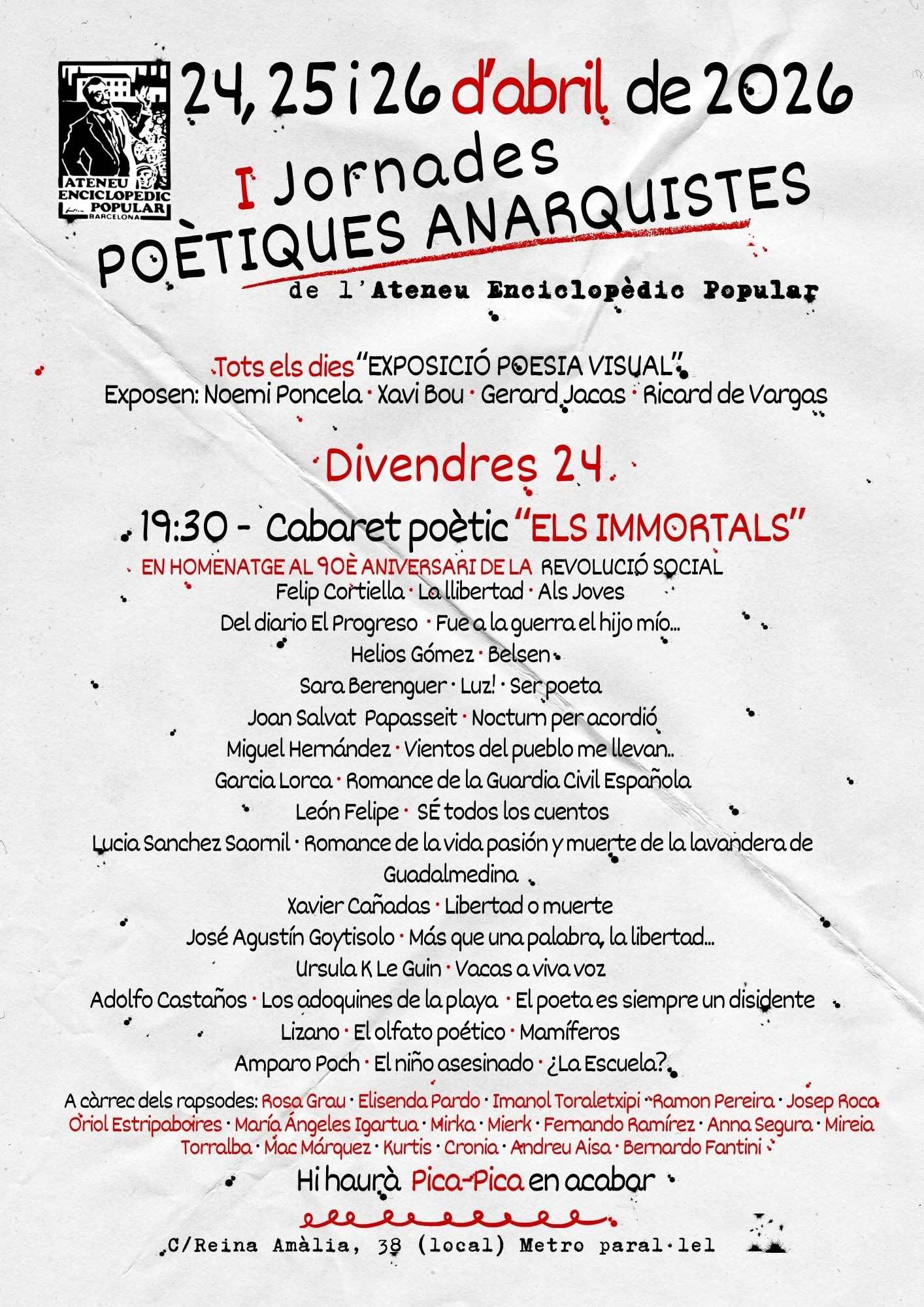 24 abril, 19:30 Cabaret poètic ELS IMMORTALS Sala Margarita Xirgu 19:30 - Cabaret poètic “ELS IMMORTALS” (en homenatge al 90è aniversari de la Revolució Social) LECTURA POÈTICA DE: Felip Cortiella · La llibertad · Als Joves // Del diario El... Read more »