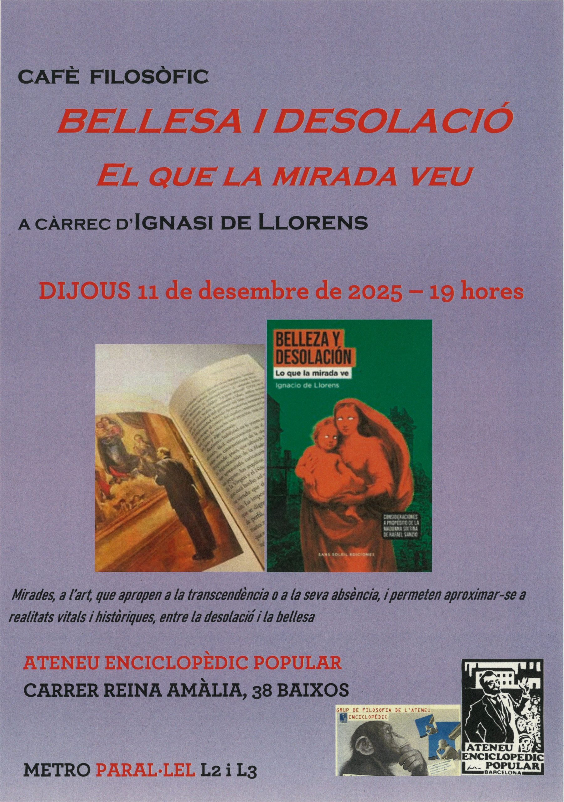 8:00 - 17:00 Bellesa i desolació. Art, estètica, ètica i història 11 desembre, 8:00 - 17:00 Bellesa i desolació. Art, estètica, ètica i història Mirades, a l'art, que apropen a la transcendència o a la seva absència, i permeten aproximar-se a realitats vitals i històriques, entre la bellesa i la desolació