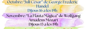 Òpera a l’Ateneu Publicat 6 d'agost de 2025 escoltar els colors i distingir-ne totes les tonalitats escoltar les emocions fins pujar-te'n el sentiment escoltar el temps, les galàxies... escoltar ÒPERA Dijous, 18/09/2025: "L'Orfeo", de Claudio Monteverdi Dijous, 16/10/2025: "Juli Cèsar", de George Frederic Handel Dijous, 13/11/2025: "La Flauta Màgica", de Wolfgang Amadeus Mozart Dijous, 11/12/2025: "El Barber de Sevilla", de Gioachino Rossini Amb…